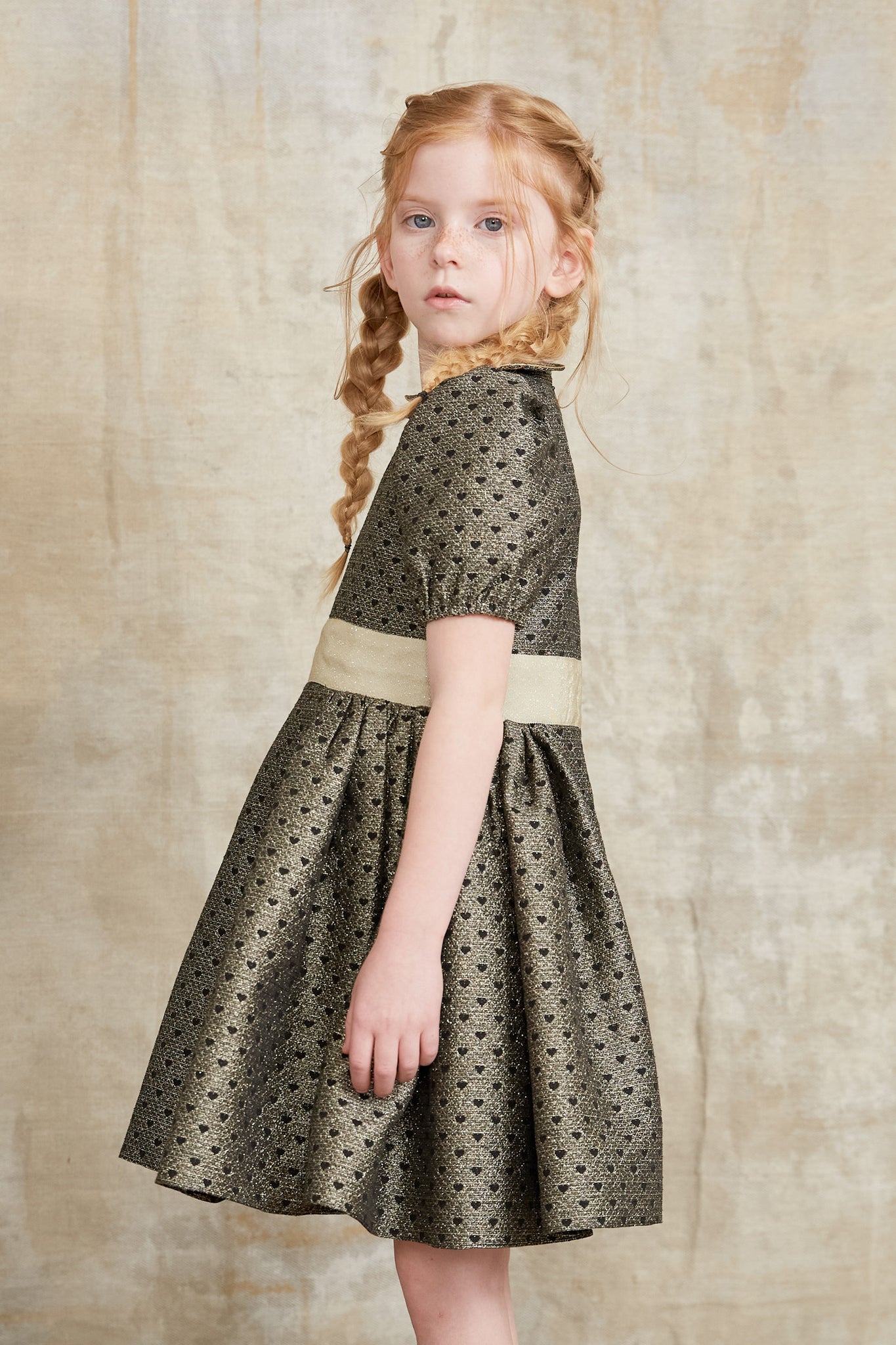 Get ready with this divine Queen dress as heads will turn to admire this truly special dress. The neat bodice features a lovely jacquard in hearts, puff sleeves, complemented by a wide gold swirly sash and beautifully crafted collar. Made with passion in London.