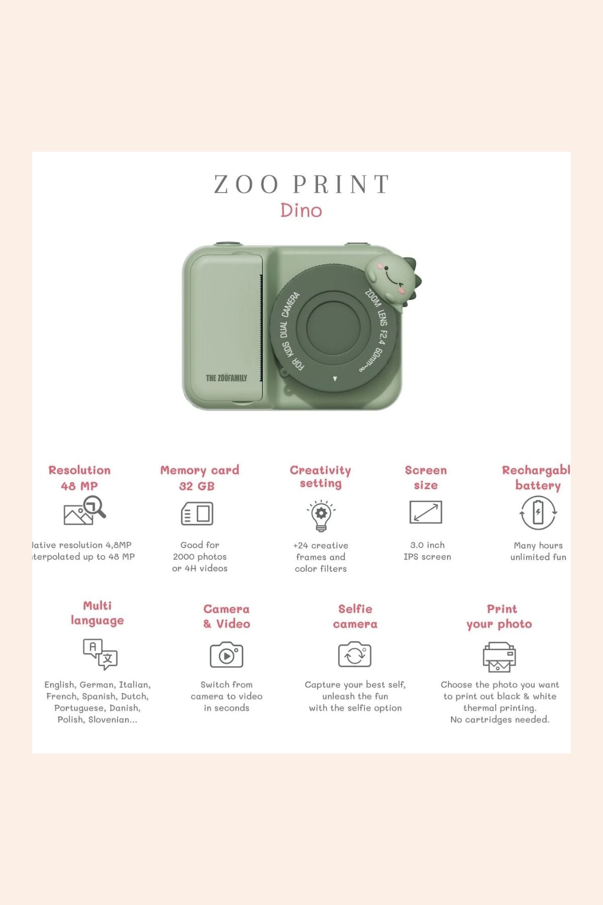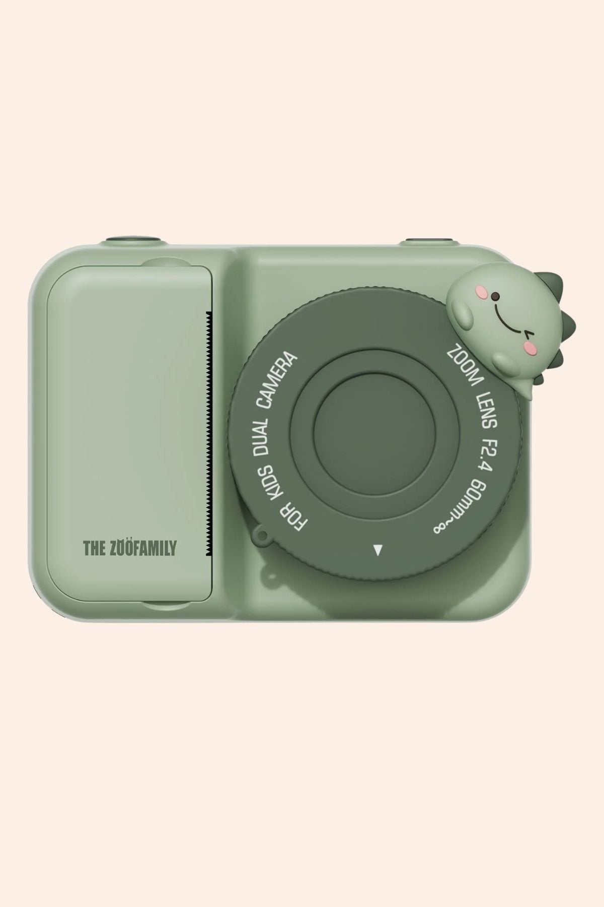 Spark their curiosity with our stylish kids' dino instant print camera! This adorable point-and-shoot camera instantly prints black and white photos directly from the camera or stores them for later printing. Plus, with heat transfer technology, there are no expensive ink cartridges to worry about. It features a vibrant 3-inch color screen, lens protection, and high print resolution.