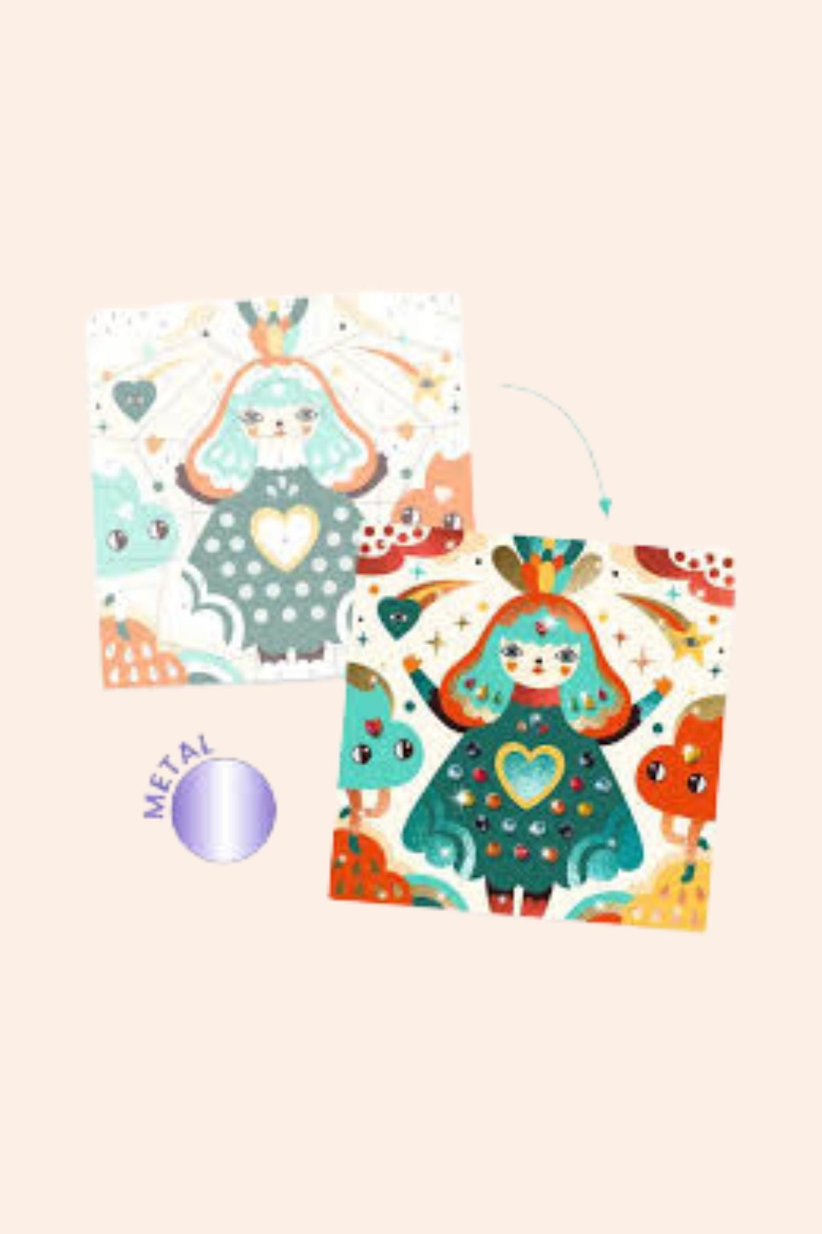 Contains - 4 pre-pasted illustrated cards (20 x 20 cm), 1 assortment of textured, coloured foil to stick down, 33 rhinestone stickers and 1 colour step-by-step instruction booklet.