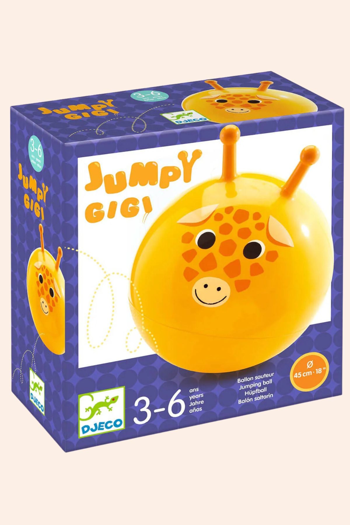 Discover the Jumpi Gigi jumping ball from Djeco, a large PVC balloon illustrated with an ergonomic handle and a non-slip area to play indoors, as well as outdoors, from 3 years old.
