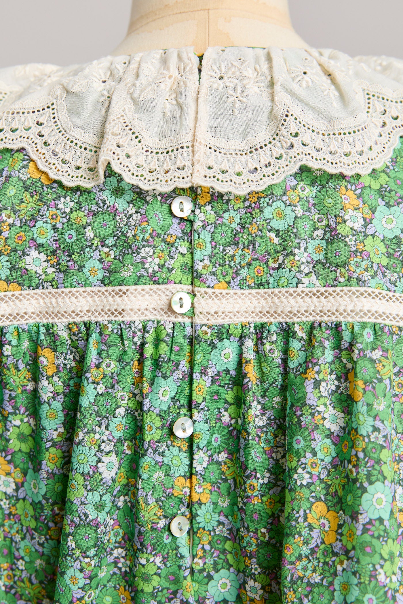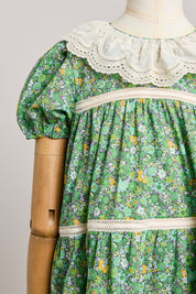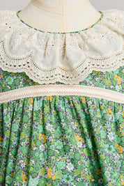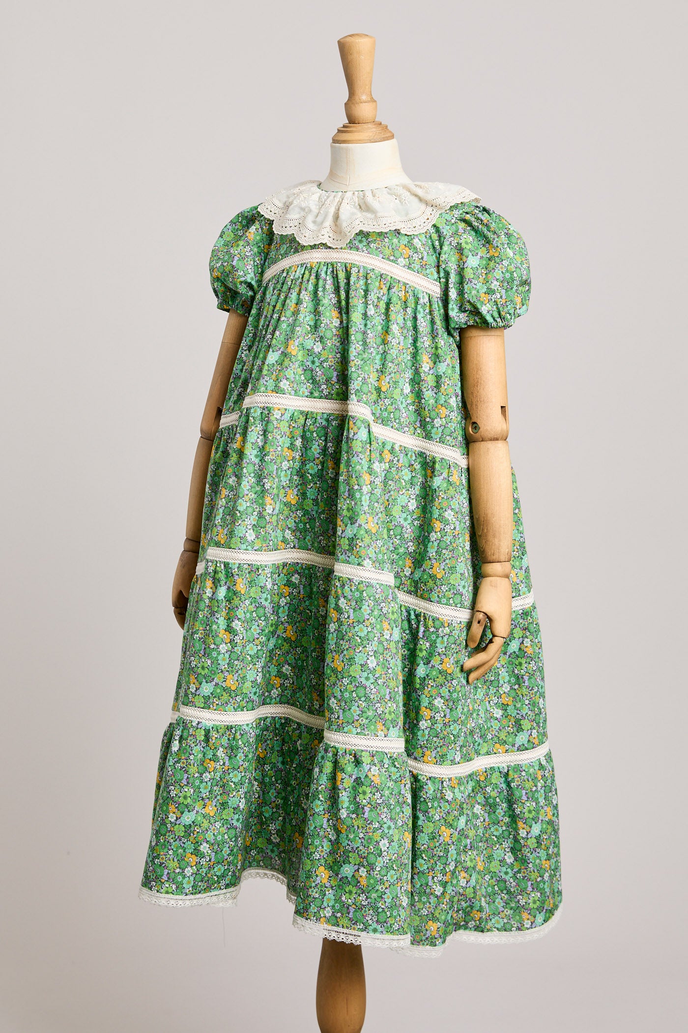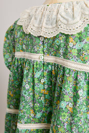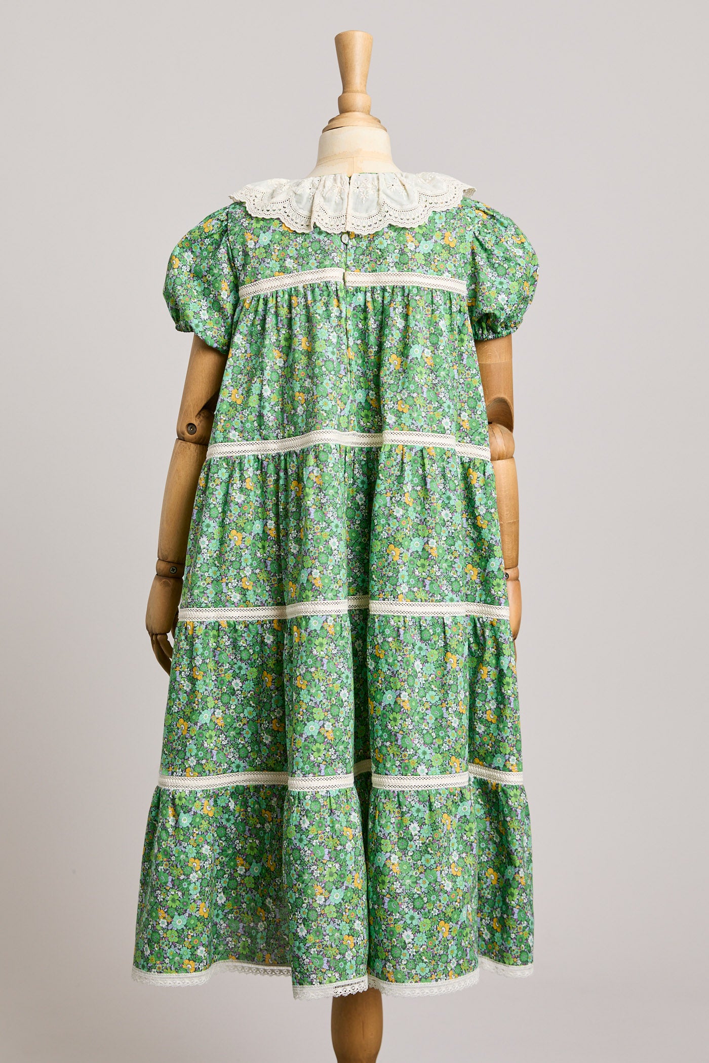 Like a stroll through an English meadow in full bloom, this enchanting Alba girl's dress is a celebration of nature’s beauty. Crafted from the finest cotton with a delicate green floral print, it captures the essence of spring and summer. The vintage-inspired silhouette features a romantic tiered skirt adorned with intricate lace trims, creating a dreamy and airy movement with every step. A scalloped lace collar and puffed sleeves add a touch of nostalgic elegance, making it the perfect dress for girls who love to twirl. Ideal for celebrations, garden parties, or as a charming heirloom piece, this dress is a timeless treasure for those looking to shop dresses for girls.