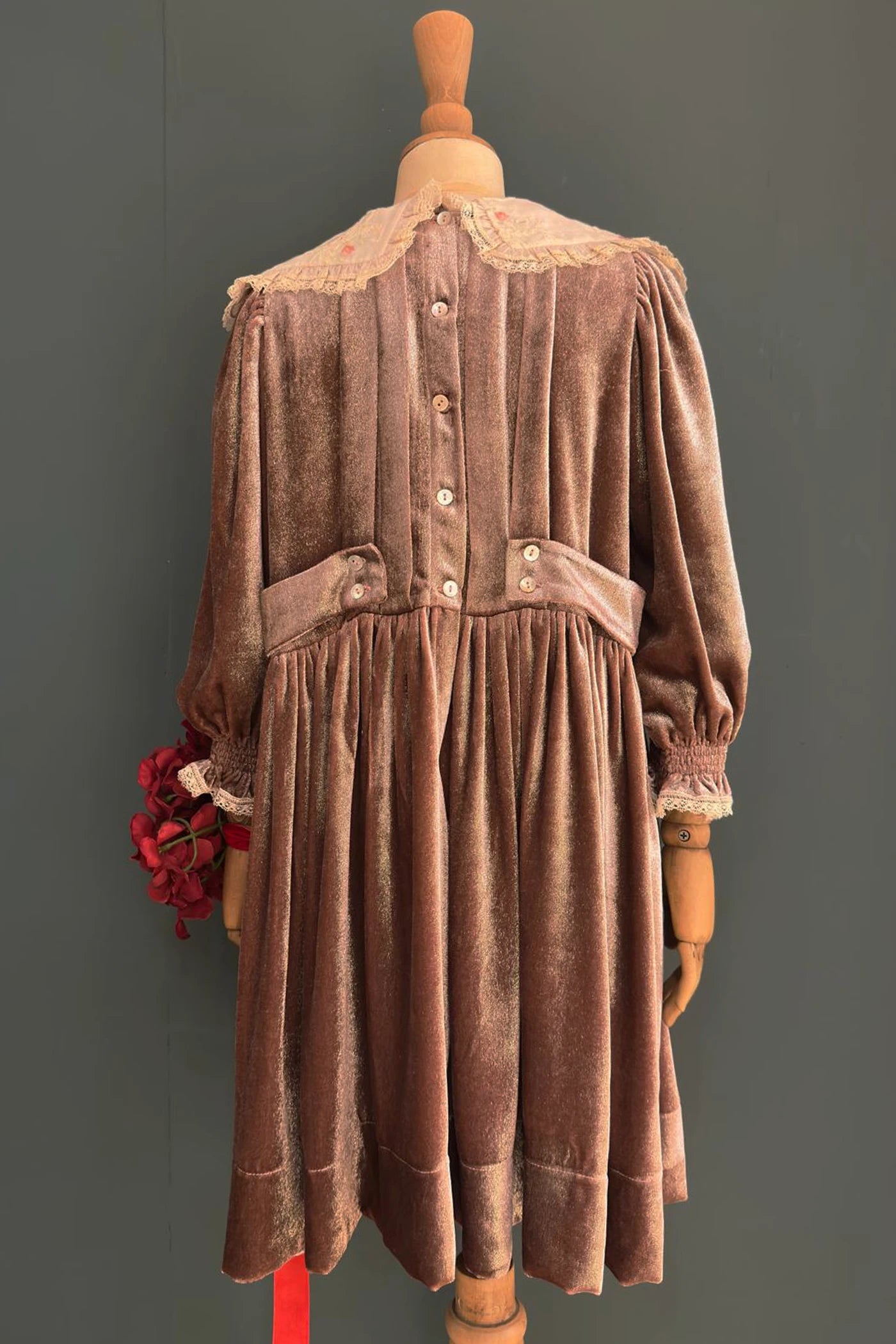 A Victorian-esque dress, angular embroidered lace-trimmed collar in a very delicate ivory lace. Cuffed sleeves with frilly lace on the edges, impeccable box pleats and detachable side belts. A floral laced collar motif to add the finishing touch with a satin ivory ribbon.