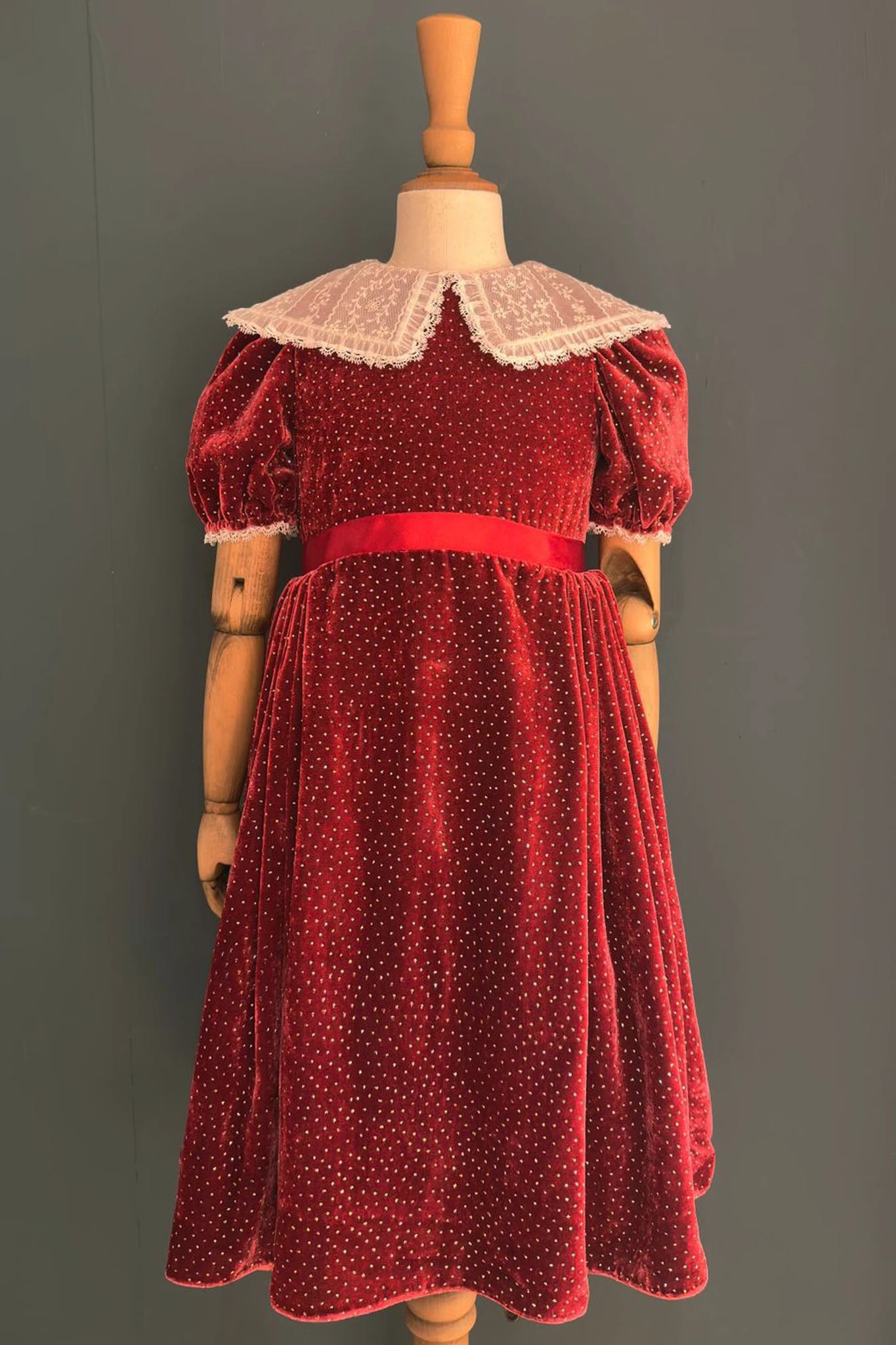 Crafted from an exquisite sparkly velvet in the deepest cranberry hue, this dress evokes the magic of frost-kissed berries on a December morning. The silhouette is classic and captivating: full twirling skirt, delicately puffed sleeves, and a graceful lace-trimmed collar that frames your little one’s face like a snowflake crown.