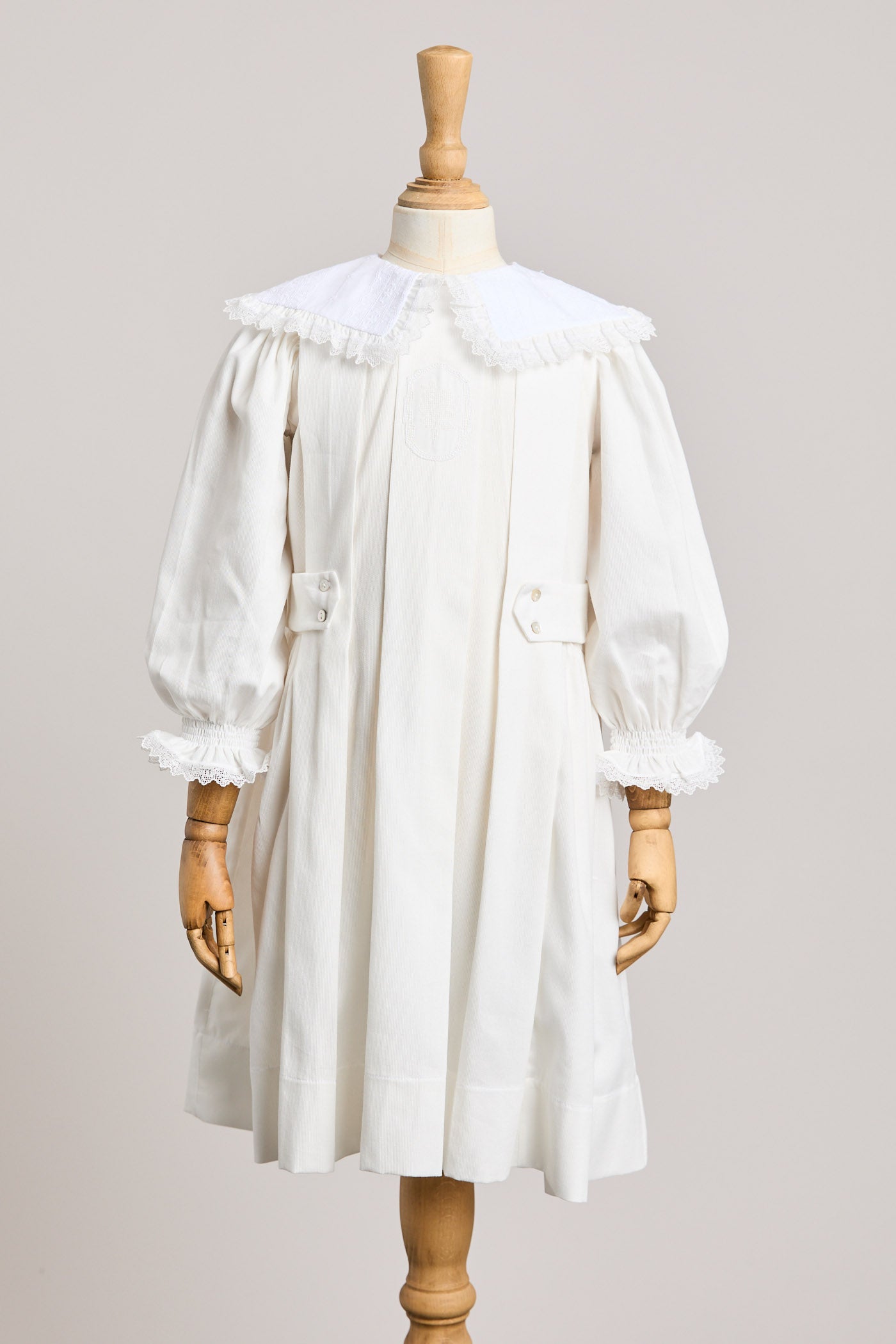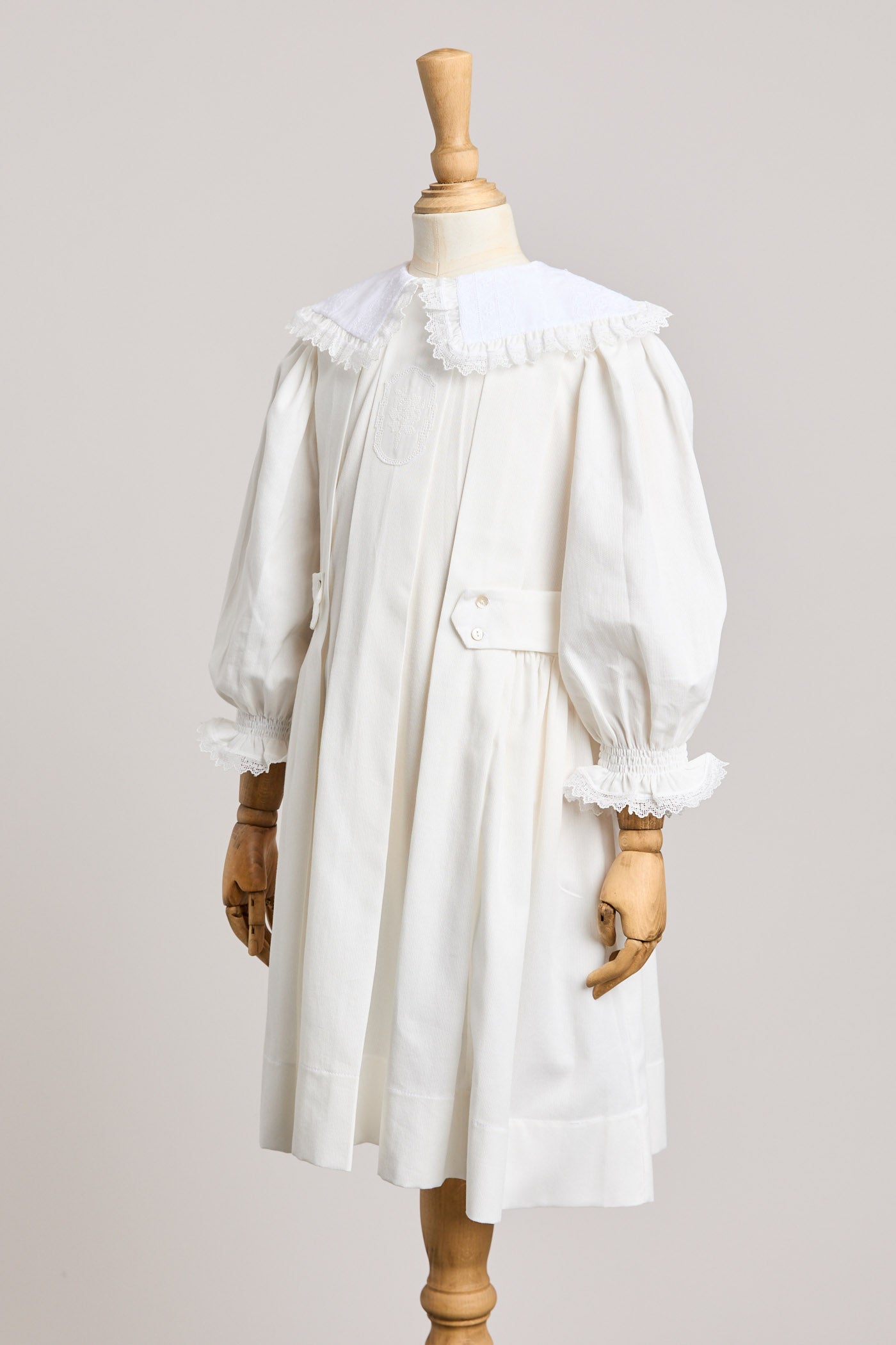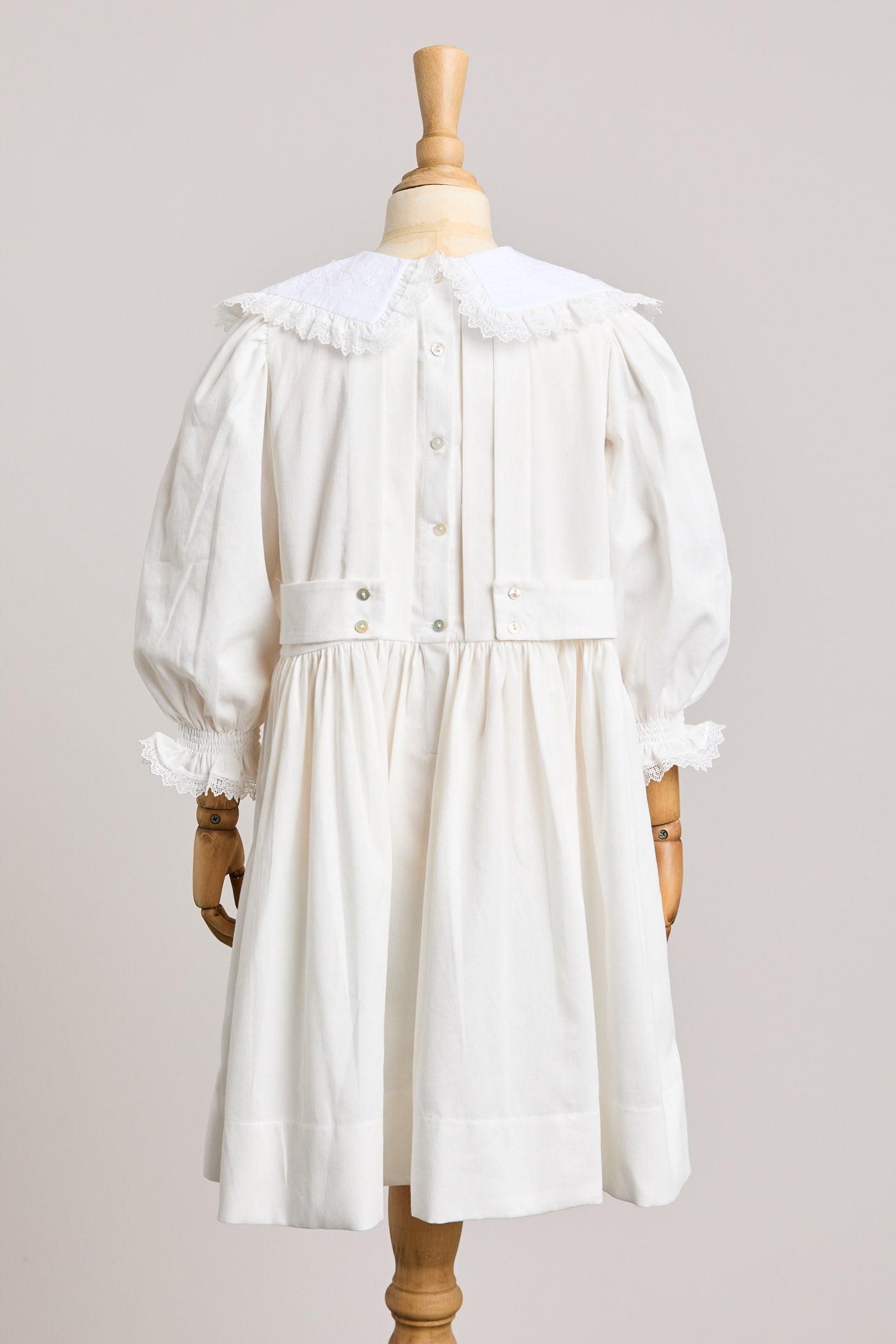 Our timeless Piano White dress never fails to impress as your little one will always be turning heads while observers appreciate this beautiful craftsmanship. Based on an original Victorian frock. Proudly parade in our Victorian-esque dress, angular embroidered lace-trimmed collar in a crisp white. Cuffed sleeves with frilly lace on the edges, impeccable box pleats and detachable side belts. A floral laced motif to add the finishing touch and our signature mother of pearl buttons. Made with passion in London.